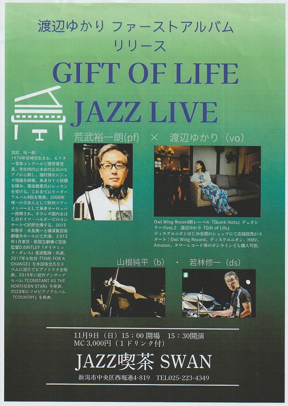 GIFT OF LIFE 渡辺ゆかり 日時:11月9日(日) 開場:15時00分 開演:15時30分 会場:SWAN 料金:3,000円 (1ドリンク付) 電話予約受付中!! TEL:025−223−4349